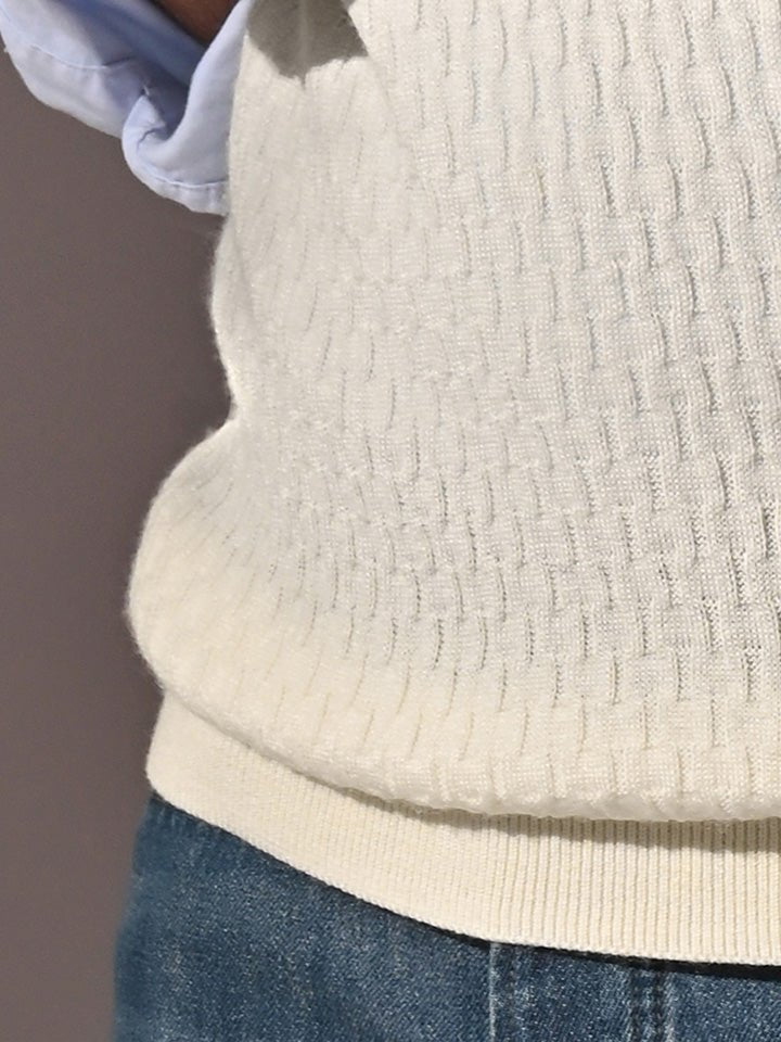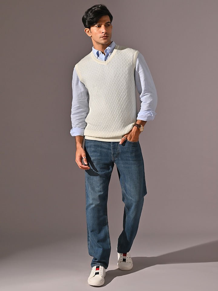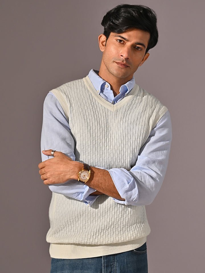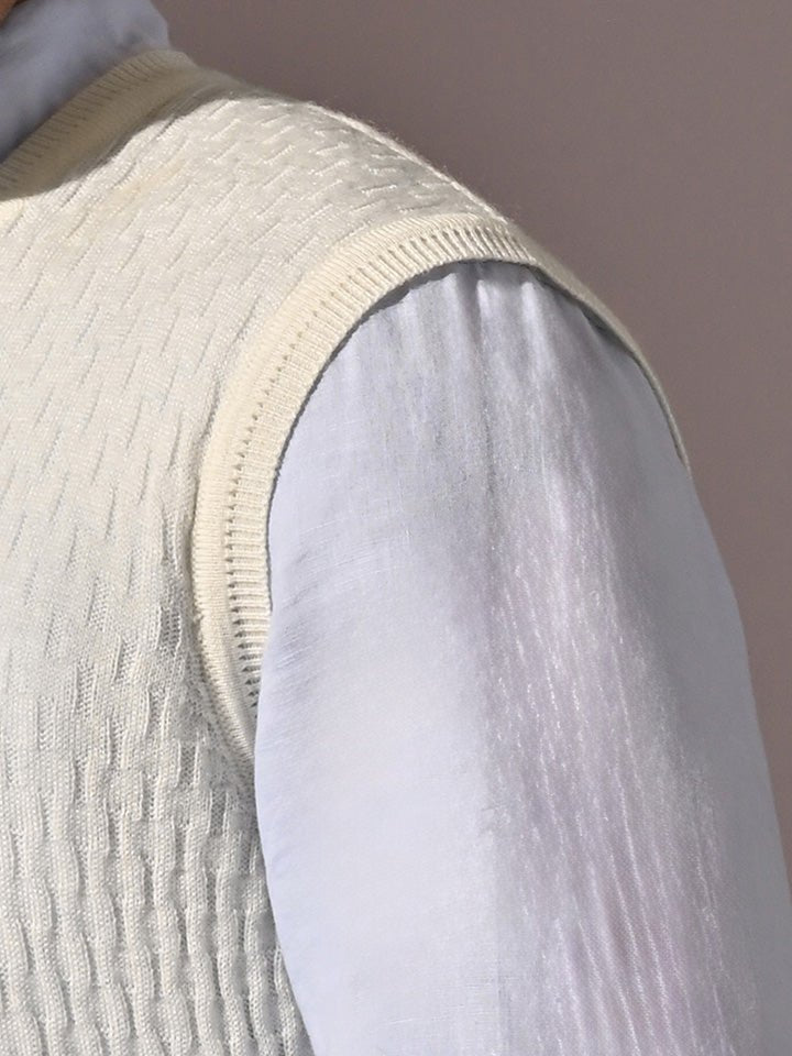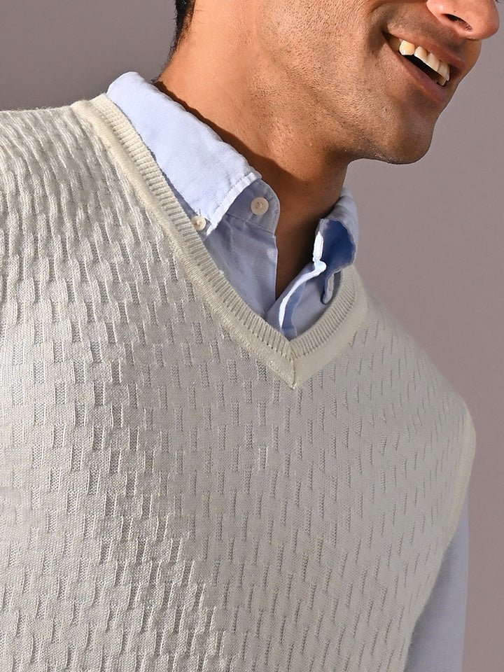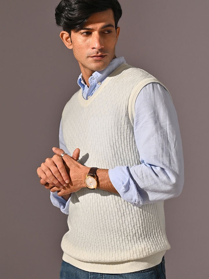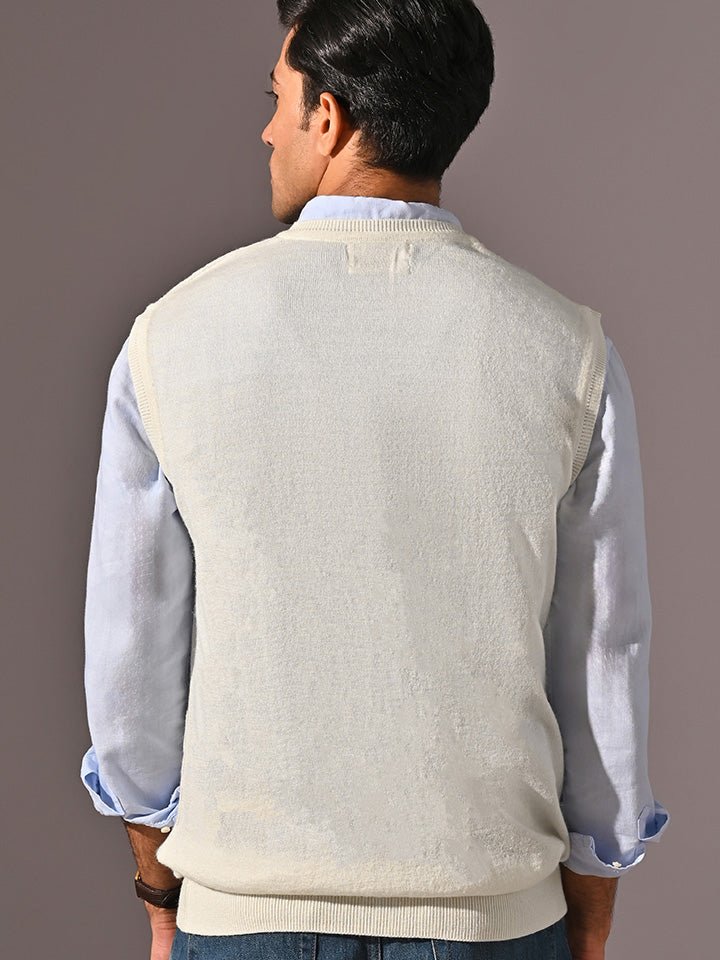 This soft Acrowool sleeveless sweater comes in an ecru shade, which is white with a hint of beige. If you enjoy a pleasant walk on a cozy wintry evening, this is a must-have in your winter wardrobe.