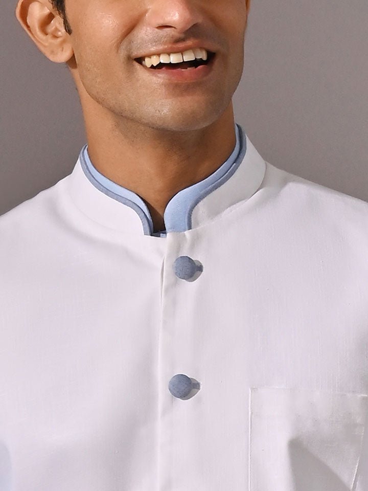 - Mandarin collar with Persian blue binding detail