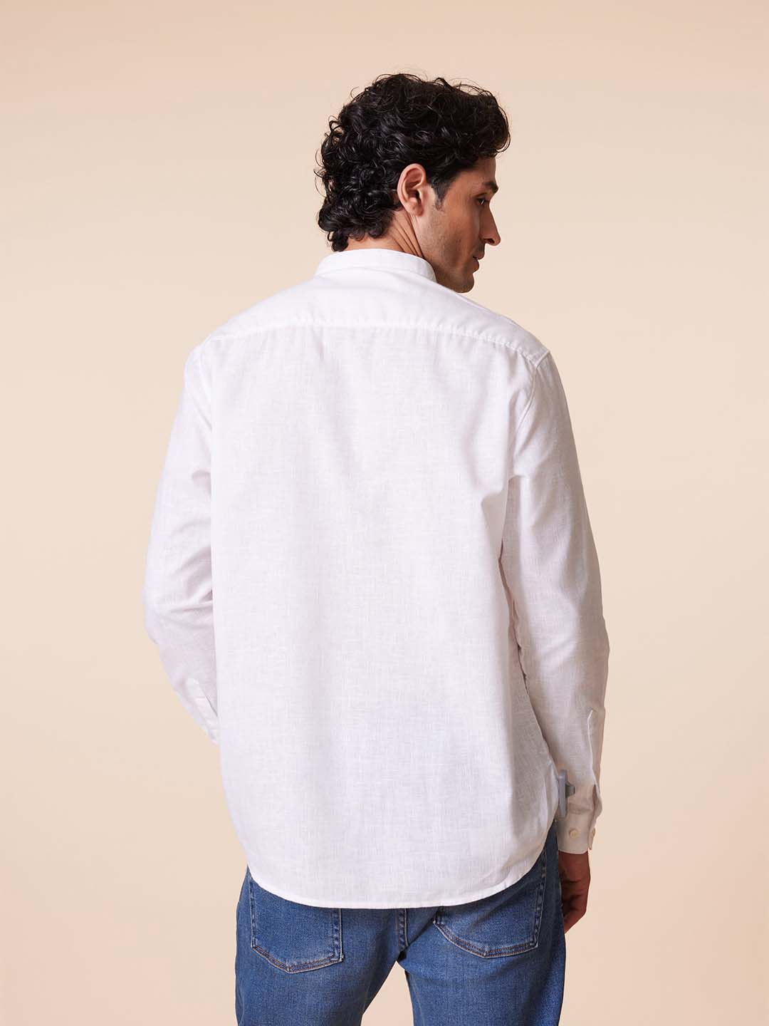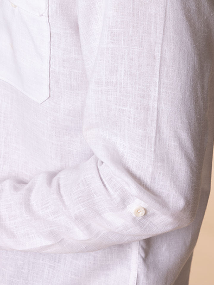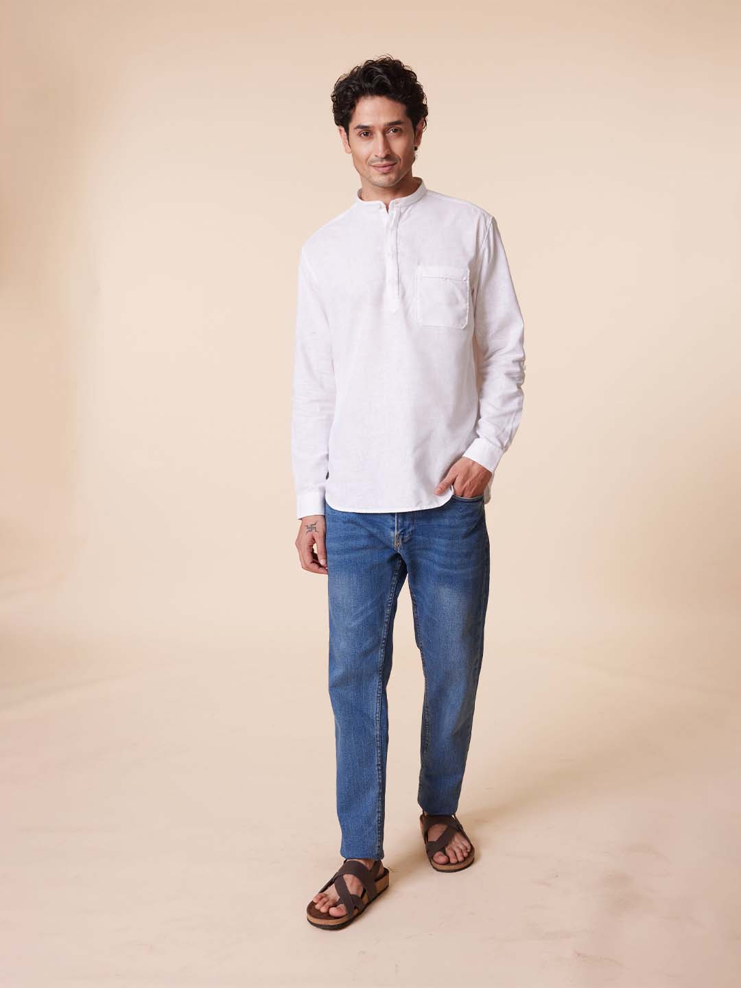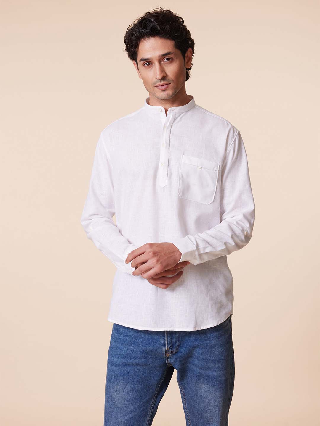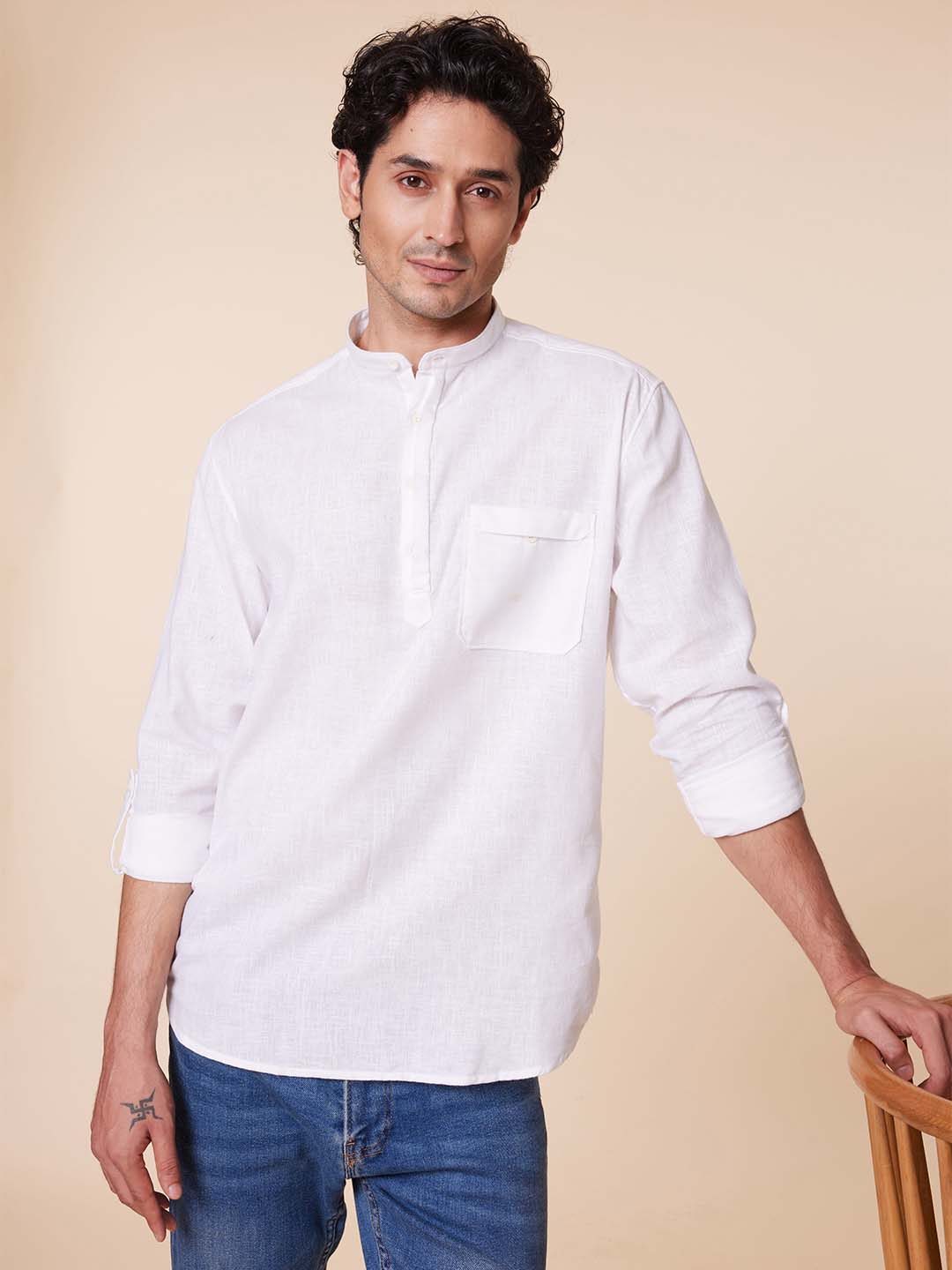 Reconnect with your roots in this patch pocket kurta-style white shirt, designed for a relaxed and comfortable fit.