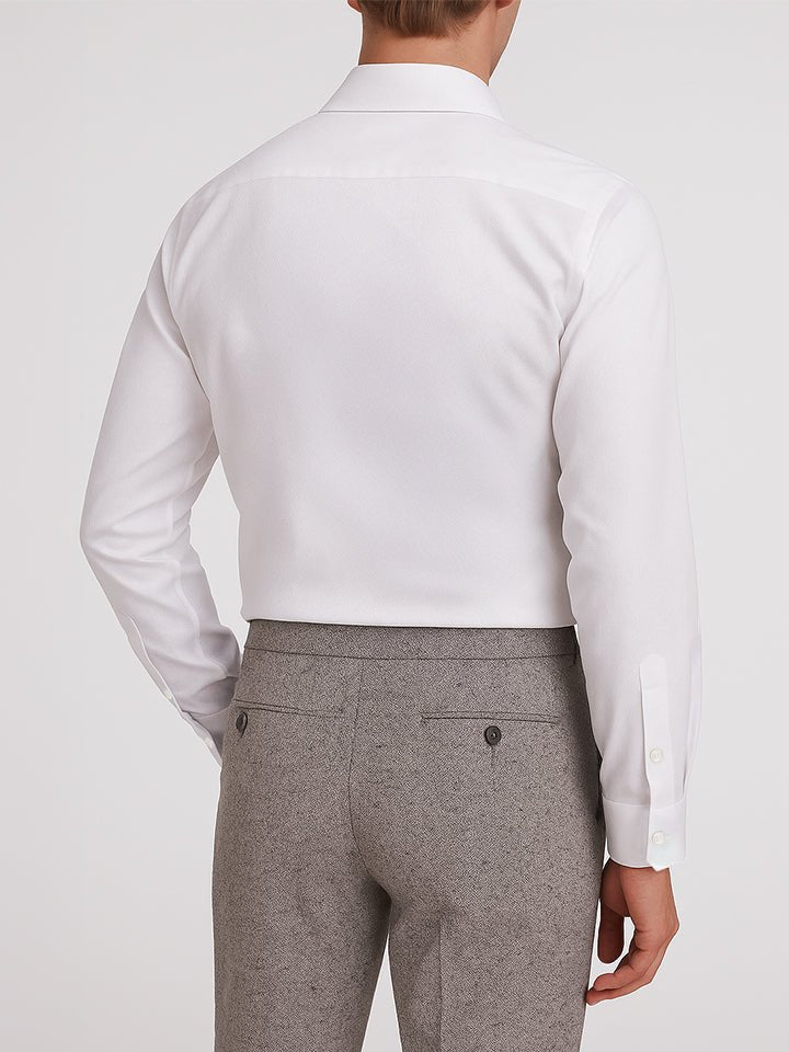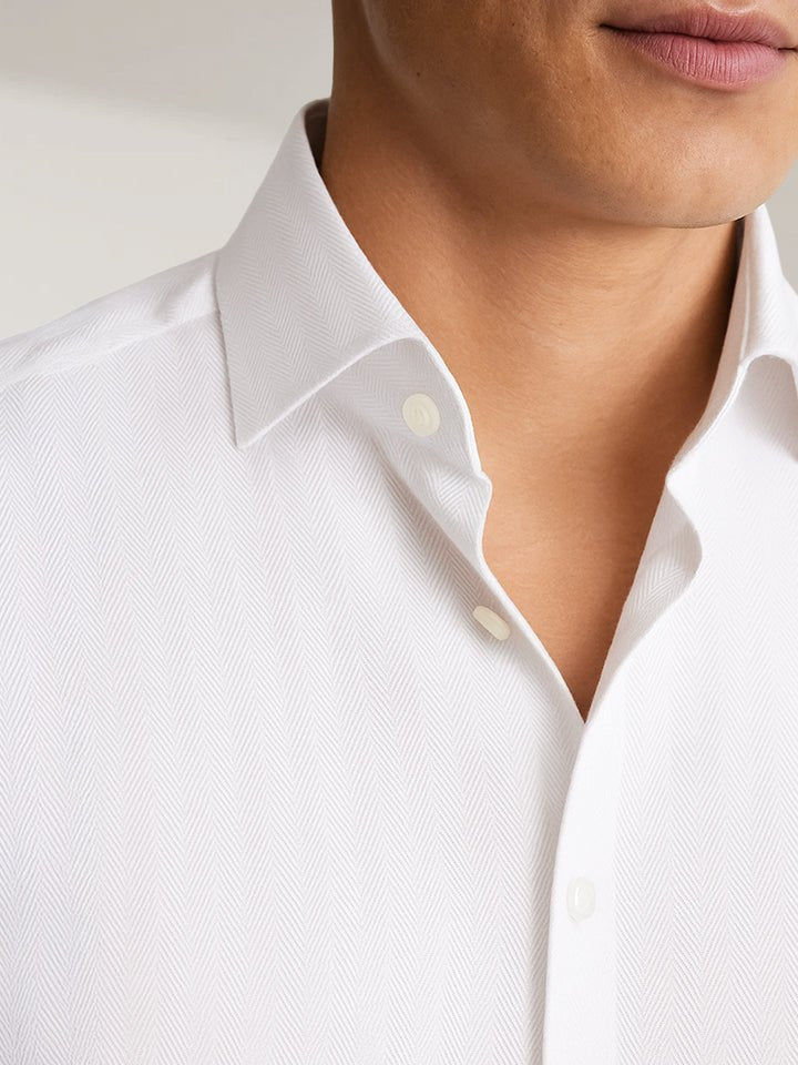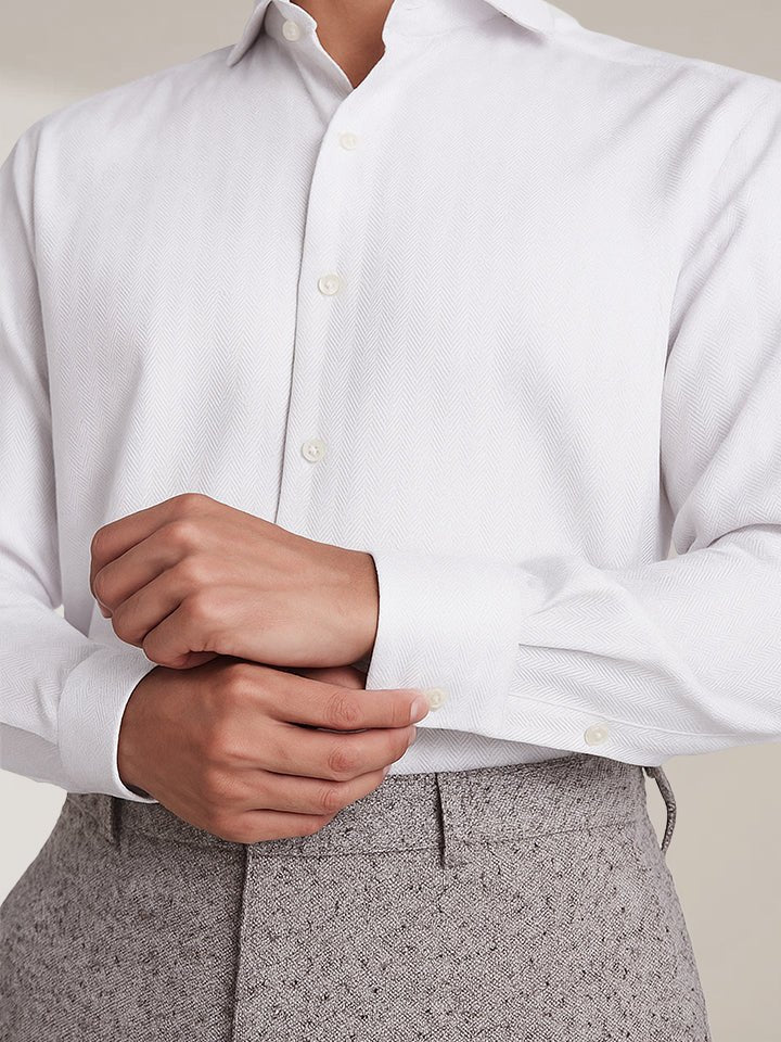 Woven from Egyptian Giza cotton, this shirt offers unmatched softness & lasting strength. The herringbone weave gives the fabric a rich texture that makes it naturally resistant to creasing & ideal for business meetings to office parties. Each seam is fully taped and reinforced with a compact stitch density of 16–18 SPI, surpassing the casual standard of 12-14 to ensure a clean, sharp silhouette that retains its shape even after repeated home launderings.