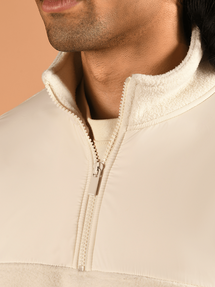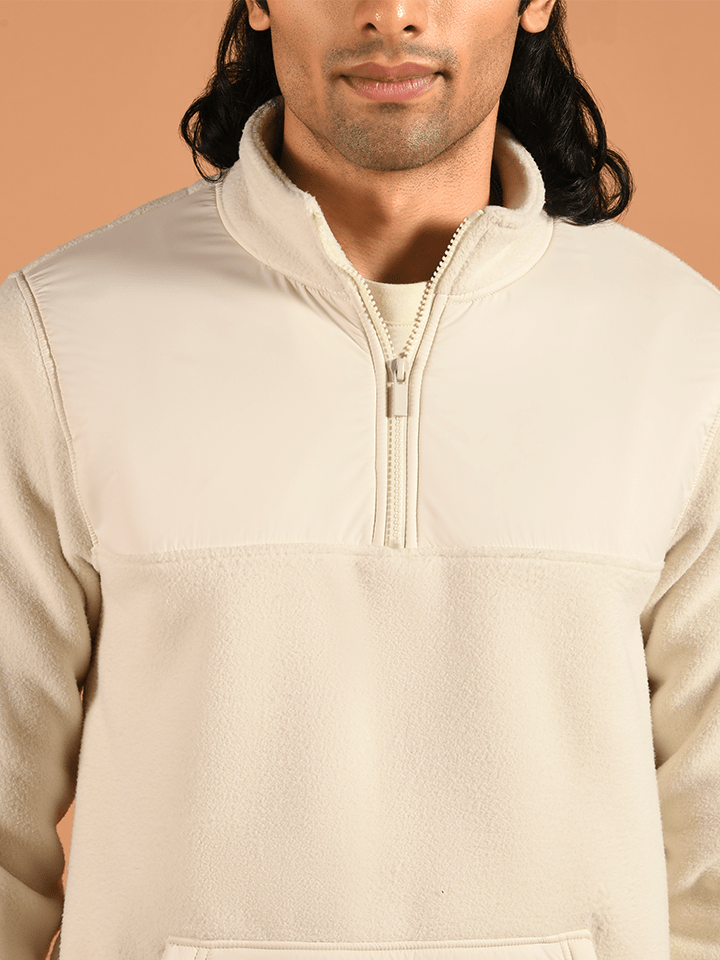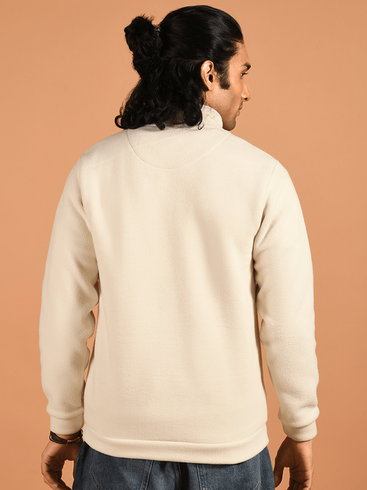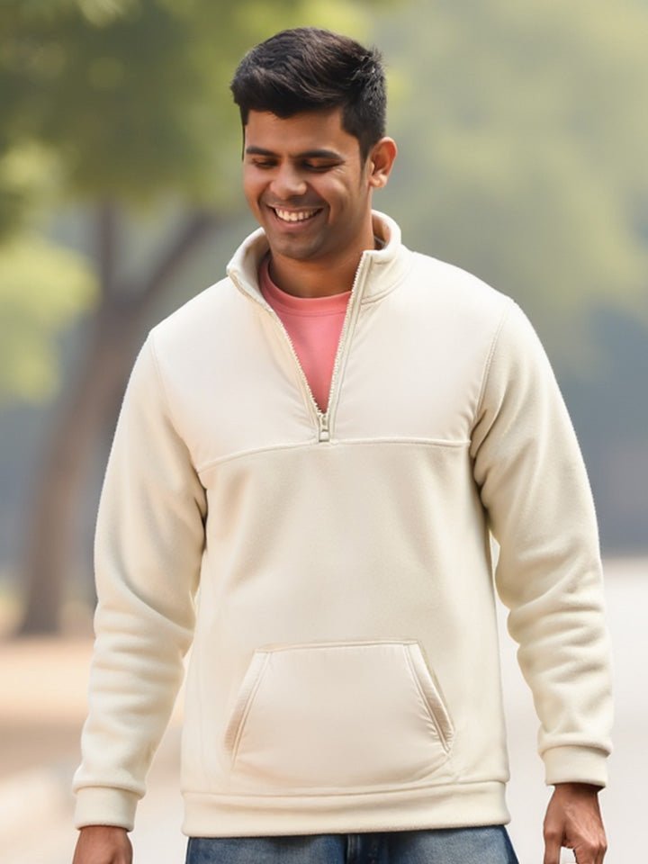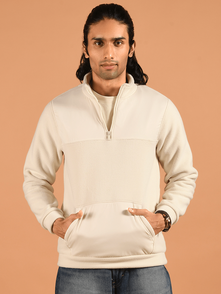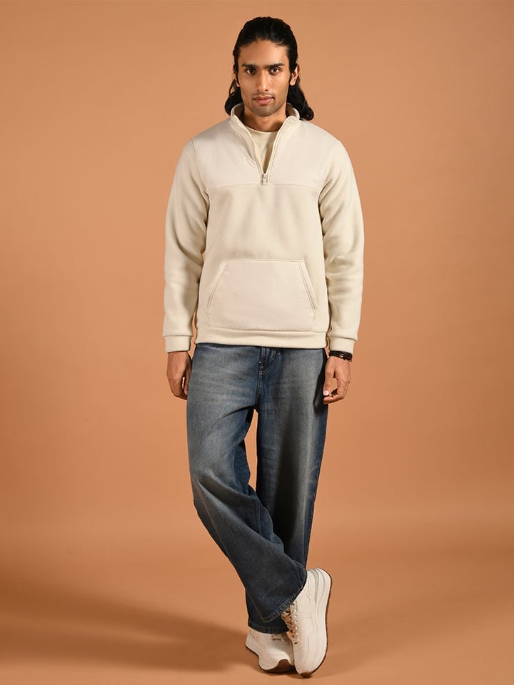 Planning a bonfire night with your partner? This light cream sweatshirt is the perfect pick for that.The high neck and quarter zip add a functional touch to this soft and warm sweatshirt.