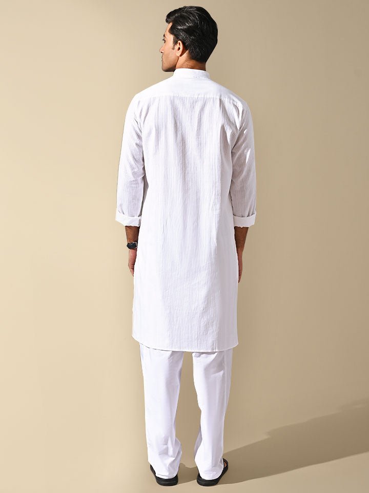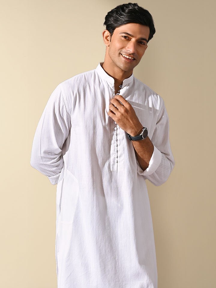 Pair this kurta with a pair of classic white pajamas and a pair of sandals.